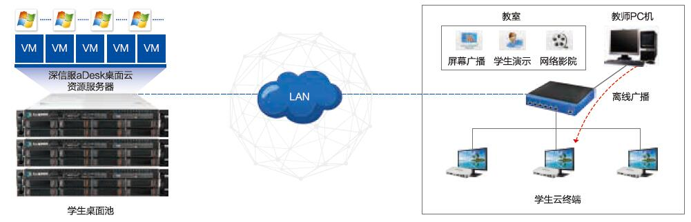 国产桌面云厂商大多数都可以提供完整的“云教室”解决方案,结合了桌面云(VDI/VOI/IDV)和自研或集成第三方电子教学管理软件,构建高效管理、促进教学、节省成本、绿色节能的教学云课堂。